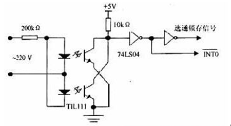 微機有多個輸入埠,接收來自遠處現場設備傳來的狀態(tài)信號,微機對這些信號處理后,輸出各種控制信號去執(zhí)行相應的操作。在現場環(huán)境較惡劣時,會存在較大的雜訊干擾,若這些干擾隨輸入信號一起進入微機系統(tǒng),會使控制準確性降低,產生誤動作。因而,可在微機的輸入和輸出端,用光耦作介面,對信號及雜訊進行隔離。典型的光電耦合電路如圖6所示。該電路主要應用在“A/D轉換器”的數位信號輸出,及由CPU發(fā)出的對前向通道的控制信號與類比電路的介面處,從而實現在不同系統(tǒng)間信號通路相聯(lián)的同時,在電氣通路上相互隔離,并在此基礎上實現將類比電路和數位電路相互隔離,起到抑制交叉串擾的作用。