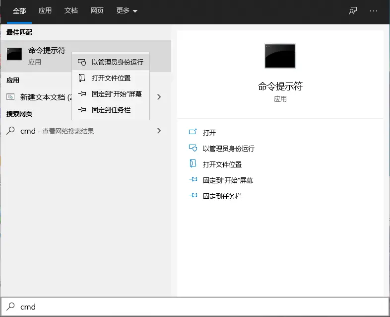 第一步:Win鍵加Q鍵打開搜索輸入cmd右鍵命令提示符,選擇以管理員運行