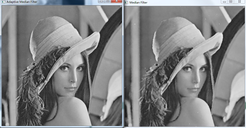 左邊是自適應中值濾波器(最小窗口為3,最大窗口為7)的結果,右圖是常規(guī)中值濾波器(窗口大小為5)的結果。可以看出,無論是中值濾波還是自適應的中值濾波,都能過濾掉圖像中的噪聲,自適應中值濾波器的效果要好些,常規(guī)的還有一些噪聲沒有過濾掉。而且,常規(guī)的中值濾波器對圖像造成的模糊較明顯,而自適應中值濾波器很好的的保存了圖像中的細節(jié)。