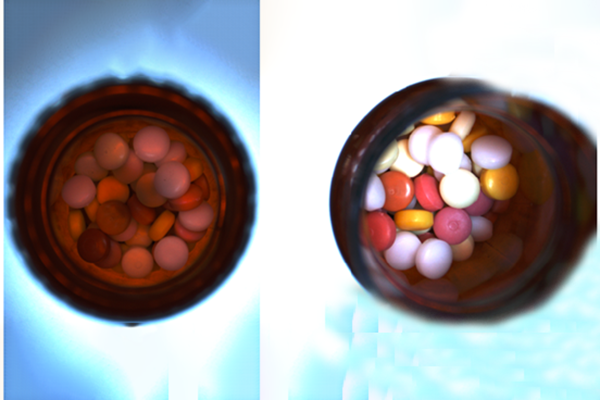 對于瓶裝的藥品,通常分玻璃瓶和塑料瓶。對于玻璃瓶,通常分為有色和無色的,無色的檢測起來會比較簡單,可以通過側(cè)面去做檢測,難度并不大。而對于有色玻璃瓶來說,因為玻璃本身的顏色影響,我們不論從側(cè)面還是正面都很難對藥丸采集到好的圖像,要分辨出藥丸的顏色就會有一定的難度,當然,我們也有解決的辦法,那就是通過一定角度的采集配合合適的打光方式來進行多方位的檢測。