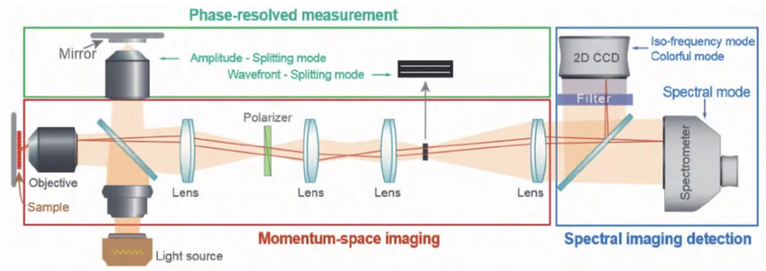 傅里葉平面成像利用光學(xué)透鏡進(jìn)行光學(xué)傅里葉變換來獲得動(dòng)量空間信息,而不是數(shù)值傅里葉變換,它不需要逐個(gè)位置掃描或角度掃描,并且適用于尺寸較微小的樣品。例如動(dòng)量空間成像光譜(MSIS)系統(tǒng),該系統(tǒng)由動(dòng)量空間成像模塊、光譜成像探測模塊和相位分辨測量模塊三部分組成。其中動(dòng)量空間成像模塊和樣品散射光接收光路中均使用傅里葉平面成像法,傅里葉平面成像法能夠快速并同時(shí)獲取各個(gè)角度的光譜,但該方法受到物鏡數(shù)值孔徑的限制。