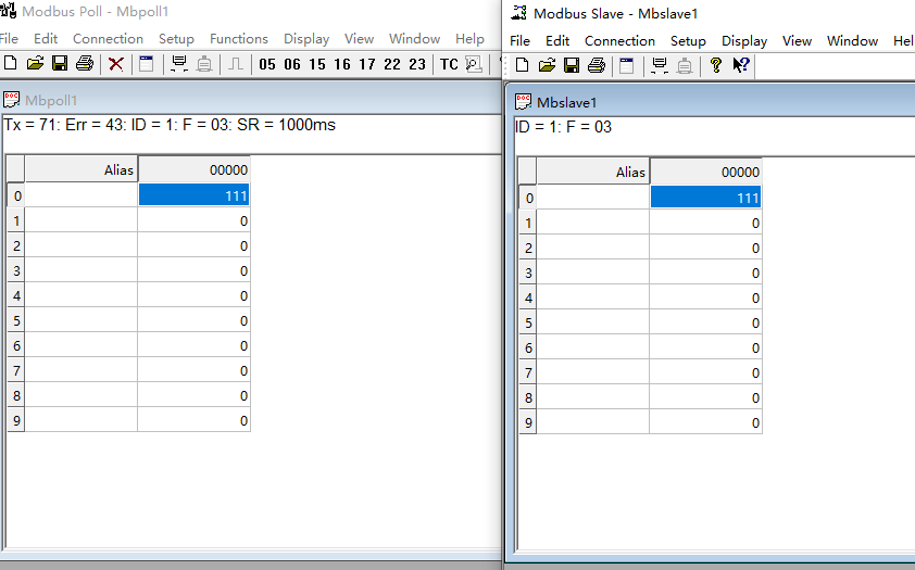 ModbusPoll與ModbusSlave的值能夠?qū)?yīng)上則測試通過