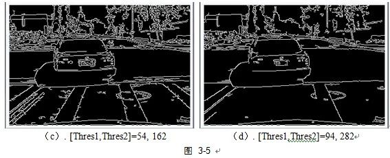 如圖 3?5所示,(a)為原圖的灰度圖,(b)為高斯濾波平滑圖,(c)和(d)分別是手動設(shè)置的高低門限值如圖所示的canny邊緣檢測結(jié)果。根據(jù)多組圖像數(shù)據(jù)測試發(fā)現(xiàn),當(dāng)canny高低門限值分別設(shè)置為50,150時能夠保證大部分有效信息的保留且不會有過多冗余信息。因此后文中采用門限值[Thres1,Thres2]= 50,120 作為canny邊緣檢測參數(shù)。Opencv中以下代碼實(shí)現(xiàn):