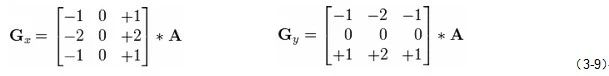 數(shù)學(xué)上在原圖像上應(yīng)用3×3的掩膜計算水平和垂直兩個方向的變化梯度近似值。如果我們定義A為源圖像,和分別作為一幅圖像的水平近似梯度和垂直近似梯度,計算方式如下: