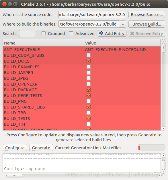 窗口的中間部分即配置列表,這里和使用cmake命令直接生成makefile文件一致的。正如上文所述,這里通過圖形界面的方式來進行配置,更加直觀方便。