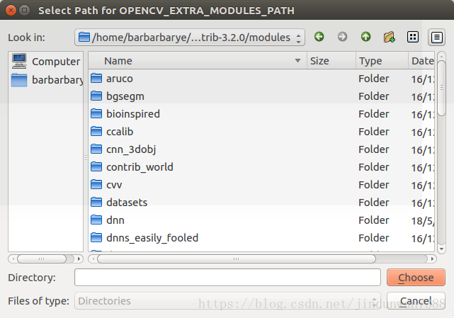然后選擇opencv_contrib-3.2.0文件夾中的modules文件夾,注意,不是只選中opencv_contrib-3.2.0文件夾就好了,需要選中里面的modules文件夾! 如下圖所示,然后點Choose。
