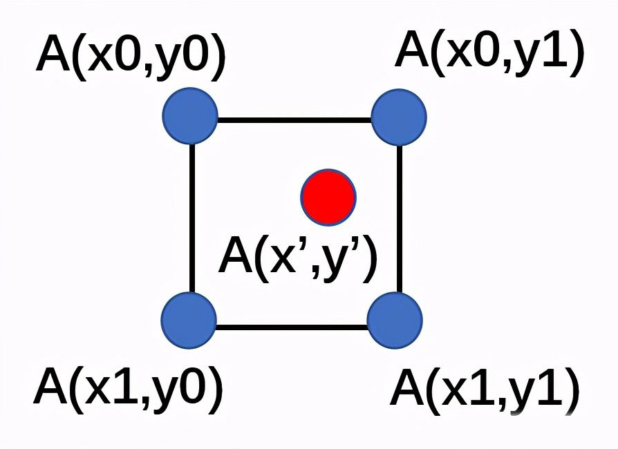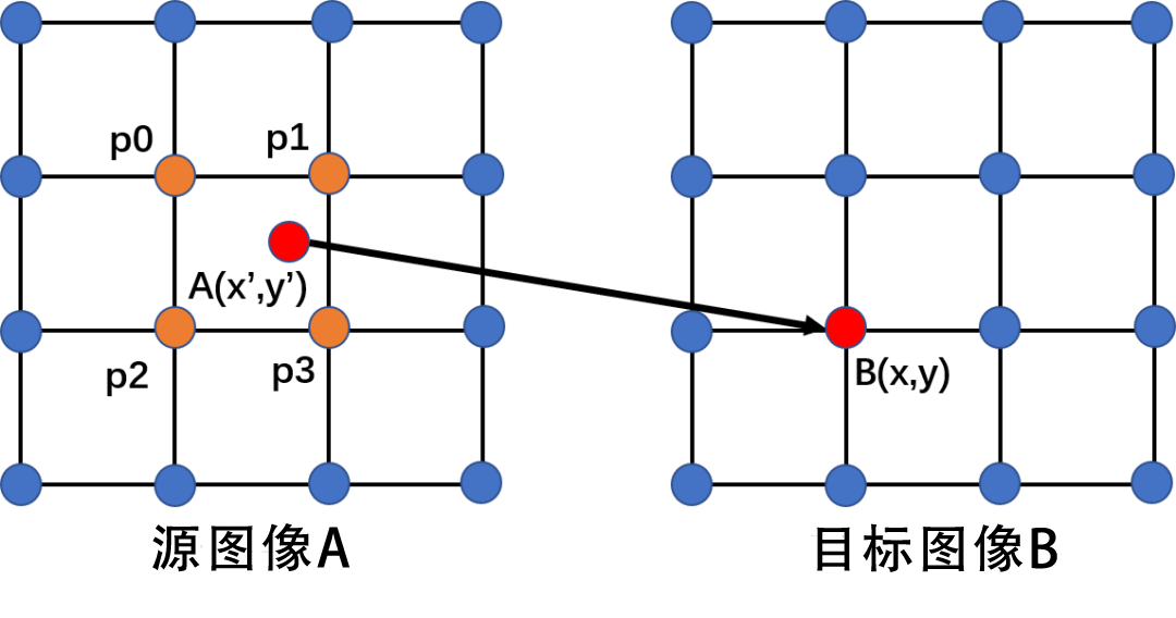 所謂插值,就是使用浮點型坐標點的周圍整型點的像素值來計算該浮點型坐標點的像素值。比如上圖中,點(x', y')為浮點型坐標點,使用其周圍整型點p0、p1、p2、p3的像素值來計算其像素值A(chǔ)(x', y'),這個過程就是插值。