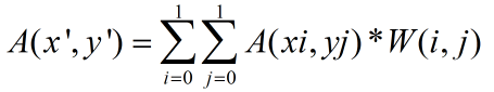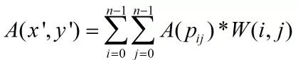 常見的插值算法有最鄰近插值、雙線性插值、雙三次插值,不管什么插值算法,其本質(zhì)都是取浮點型坐標點周圍的n*n個整型坐標點的像素值進行加權(quán)和,從而得到該浮點型坐標點的像素值,如下式: