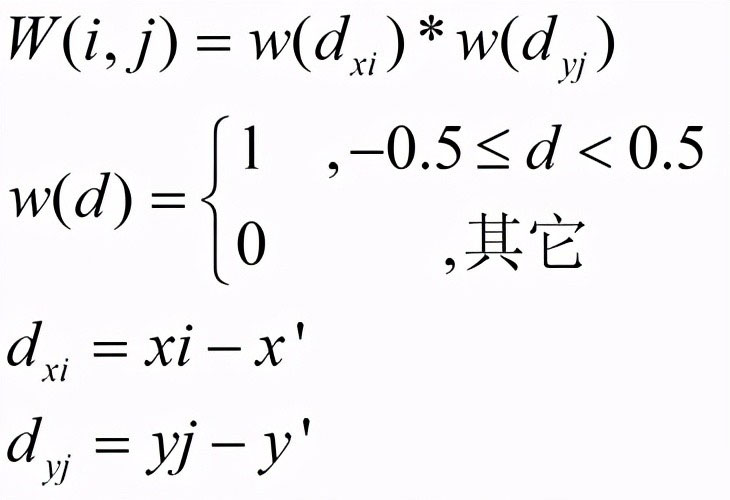 不同插值算法的區(qū)別在于權(quán)重W的計算不一樣,下文將分別詳細講解最鄰近插值、雙線性插值、雙三次插值的計算原理與實現(xiàn)。