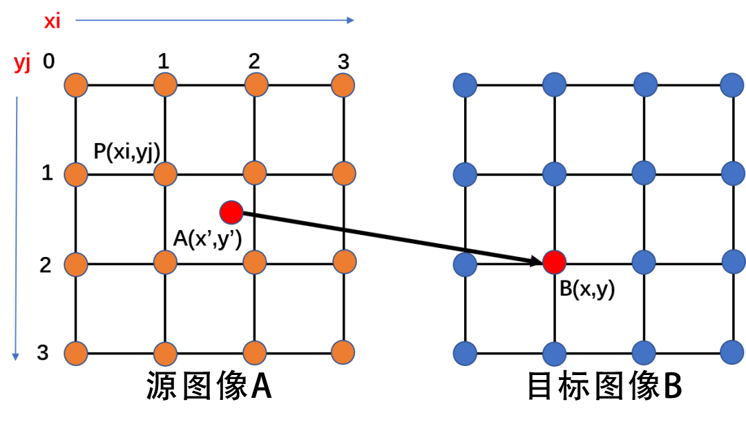 像素重采樣的常見應用場景為圖像縮放和圖像配準。在實際應用過程中,源圖像A的對應坐標往往不是整數(shù),而是浮點型數(shù)據(jù)(如下圖所示),因此不能直接取其像素值賦值給目標圖像上的對應點。此時要獲取點A(x', y')的像素值,插值算法就派上用場了。