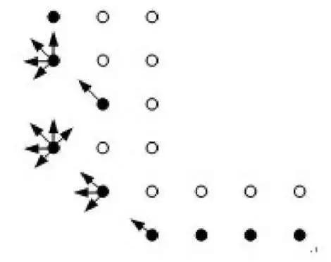 跟蹤準(zhǔn)則:按起始點(diǎn)選取準(zhǔn)則找到最左下方位的邊界點(diǎn)后,以其為起始點(diǎn),定義左上方為初始搜索方向,若該方向的點(diǎn)為黑點(diǎn)(特征點(diǎn)),則判其為邊界點(diǎn),否則沿順時(shí)針方向旋轉(zhuǎn)搜索方向45度,依此類推,直到搜索到第一個(gè)黑點(diǎn)(特征點(diǎn))為止,然后再把該黑點(diǎn)(特征點(diǎn))作為新的邊界點(diǎn),逆時(shí)針方向旋轉(zhuǎn)當(dāng)前搜索方向90度,用相同的方法繼續(xù)搜索下一個(gè)黑點(diǎn)(特征點(diǎn)),直到找到初始邊界點(diǎn)為止。若用箭頭表示搜索方向,那么該輪廓跟蹤算法可以用圖表示。