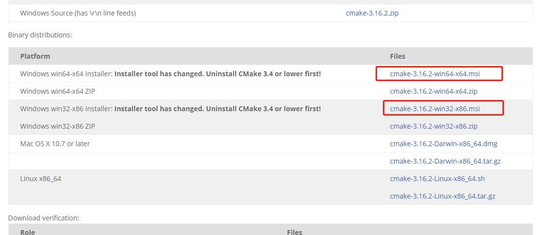 1)下載cmake : https://cmake.org/download/ 在這我選擇可以直接在windows安裝的文件,如我這下載的是 cmake-3.16.2-win32-x86.msi。可以根據(jù)自己的系統(tǒng)來選擇32位或者64位。