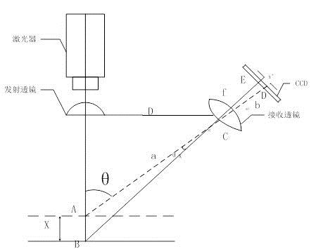 當(dāng)被測物體表面移動x,反應(yīng)到光敏面上像點位移為x’。a為接收透鏡到物體的距離(物距),b為接收后主面到成像面中心的距離(一般取焦距f),θ為激光束光軸與接收透鏡之間的夾角。D為激光光束軸到透鏡中心的距離。接收透鏡的焦距為f,其余的參數(shù)如下圖: