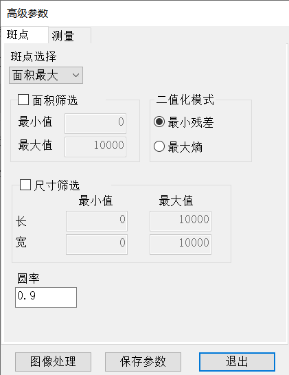 斑點(diǎn)分析的前提是把斑點(diǎn)與背景分割開來。一般情況下,默認(rèn)使用【最小殘差】即可處理絕大部分的圖像。當(dāng)圖像明暗不明顯,或斑點(diǎn)與背景對比不明顯時(shí),使用【最小殘差】的效果將受到影響,這時(shí)使用【最大熵】會(huì)得到較理想的效果。