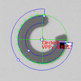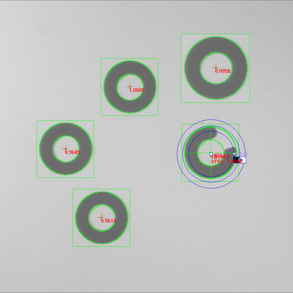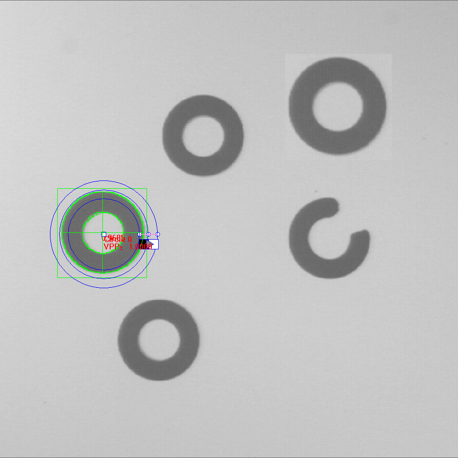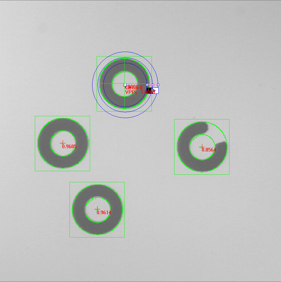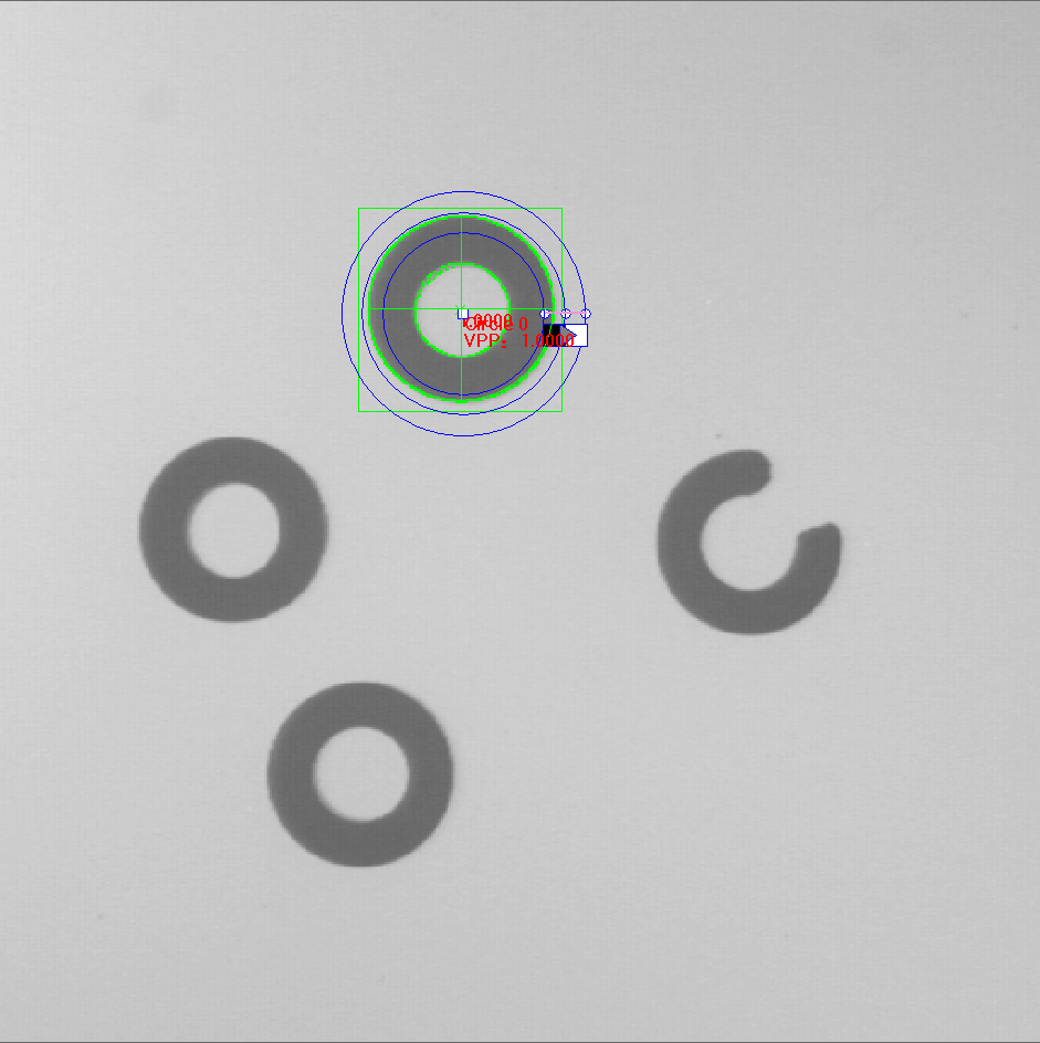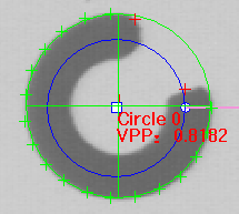 該參數(shù)表示參與擬合圓的有效點(diǎn)數(shù)量占總測(cè)量路徑數(shù)量的百分比。由于邊緣殘缺或部分邊緣點(diǎn)被剔除等情況,使得參與擬合圓的邊緣點(diǎn)數(shù)目減少,但不能低于該參數(shù)值,否則測(cè)量失敗。下圖中,有效點(diǎn)比例VPP:0.8182