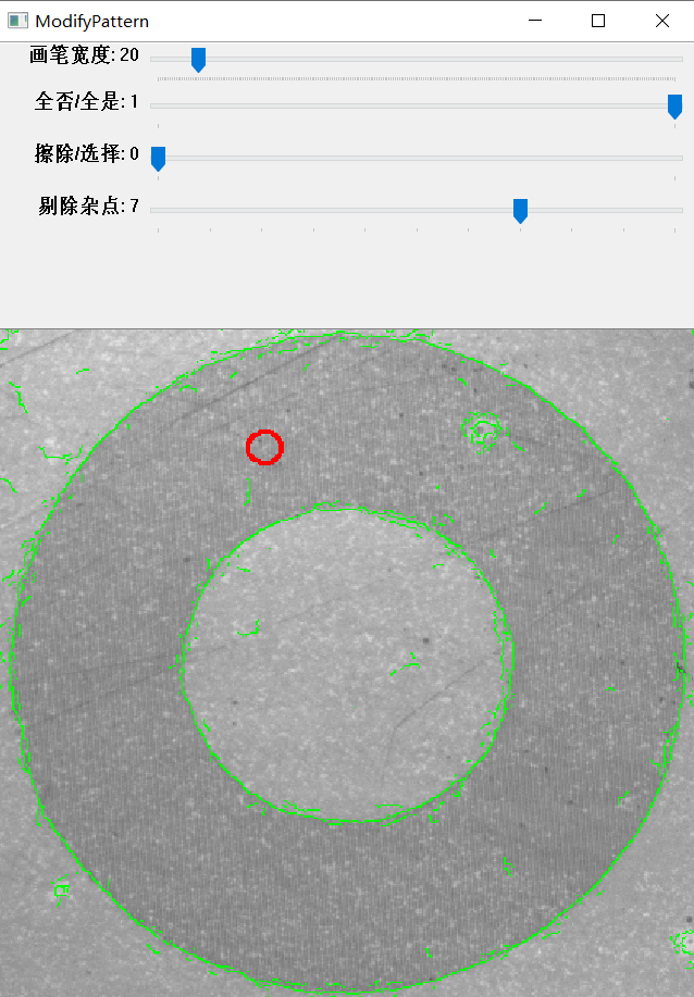 當(dāng)圖像的質(zhì)量較差時(shí),邊緣模糊產(chǎn)生大量的雜點(diǎn);從而增加了搜索的時(shí)間,同時(shí)影響了搜索的準(zhǔn)確性。通過(guò)調(diào)整【剔除雜點(diǎn)】去除大部分的干擾點(diǎn),優(yōu)化了模板的輪廓信息。