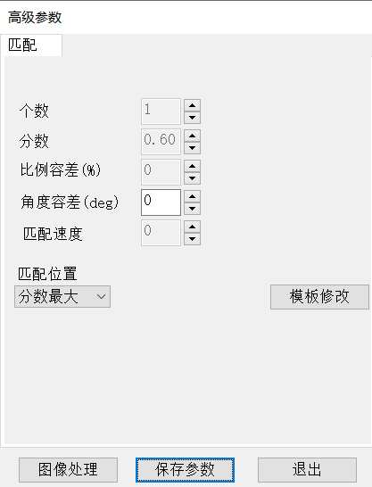 通過鼠標操作ROI選定模板,進入【高級參數(shù)】設(shè)置匹配角度范圍,最小相似度分數(shù)。