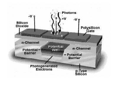 CCD單元部分,就是一個由金屬-氧化物-半導體組成的電容量,簡稱MOS。