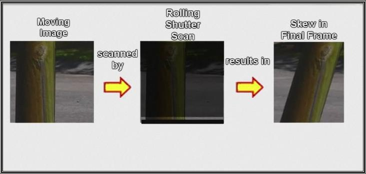 A. ROLLING SHUTTER is very different. The rolling shutter actually exposes different portions of the frame at different points in time, “rolling” through the frame. Again, it’s not an actual physical moving shutter that’s doing this (as opposed to a movie camera, which actually has a moving physical shutter). Instead, the sensor is telling different portions to become light-sensitive at different moments in time, and as this process proceeds down the course of the full frame, until the entire frame is exposed.