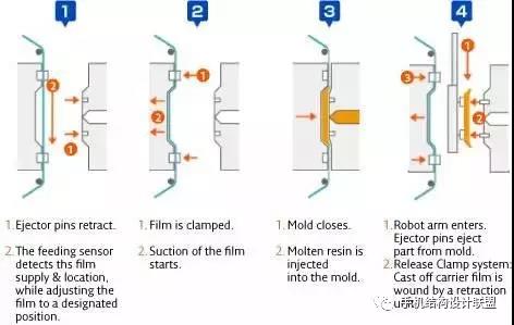 在進行IMD 生產(chǎn)時,轉(zhuǎn)印箔定位于動模模腔中,然后注塑,離型層會汽化,使載體和顏色層分離,此時顏色層通過熱熔膠與注塑件結(jié)合。注意:進行IMD 生產(chǎn)時,模具的頂桿是設計在定模上,即注塑完成后,塑件留在定模上,由頂桿推出。