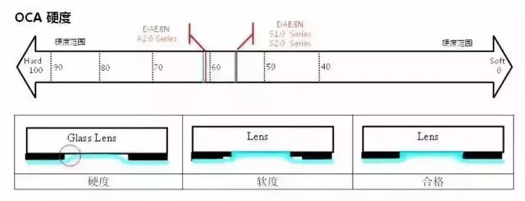 OCA不同的厚度會有一個對應(yīng)的硬度值,太硬或太軟都會影響全貼合的使用,一般的硬度控制值58-65之間。