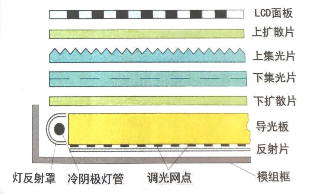主要組成為發(fā)光源(Light source) 、導(dǎo)光板(light guide plate) 、膠框(housing) 、反射片(Reflector) 、擴(kuò)散片(Diffuser) 、增光片(BEF、棱鏡片)、黑白膠(Curtain Tape) 等。