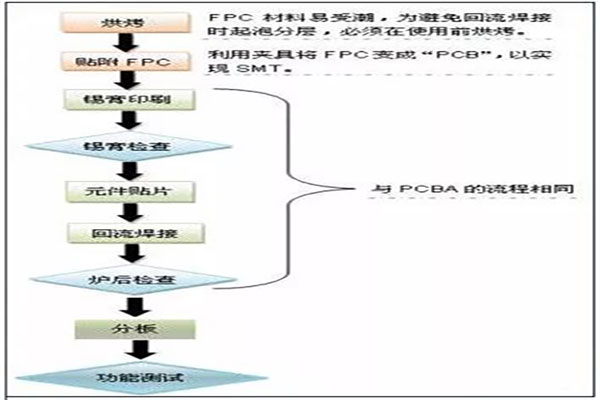 此類生產(chǎn)方式的重點(diǎn)是FPC的貼附/和固定。FPC貼附的目的就是利用夾具把FPC變成“PCB”,使FPC能像“PCB”一樣進(jìn)行SMT。其簡(jiǎn)化的工藝流程為: