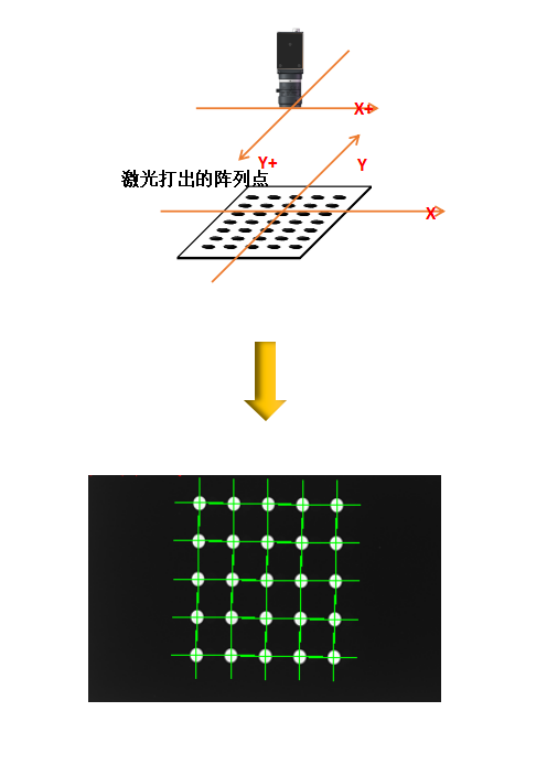 系統(tǒng)采用宮格標(biāo)定,自定義行列數(shù)和間距,控制激光器打出陣列點(diǎn),然后通過相機(jī)進(jìn)行圖像處理獲取對(duì)應(yīng)的像素坐標(biāo)點(diǎn)。利用算法將相機(jī)像素坐標(biāo)與激光器的坐標(biāo)進(jìn)行統(tǒng)一。