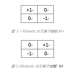 Roberts交叉算子實(shí)現(xiàn)的基礎(chǔ)是一階邊緣檢測,利用兩個(gè)模板,計(jì)算對角線上而不是坐標(biāo)軸上的兩個(gè)像素的微分。這里命名這兩個(gè)模板分別為M+,M-