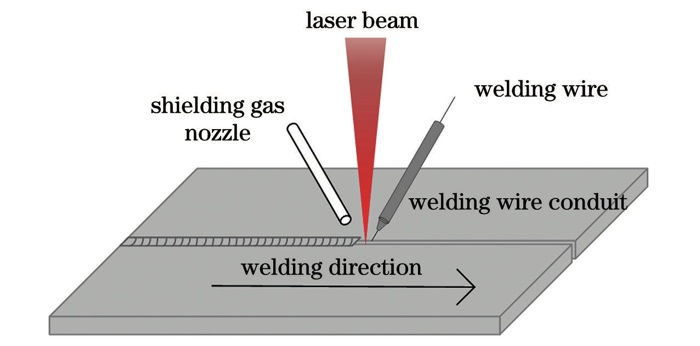 激光填絲焊接工藝原理如下:通過在焊縫中預(yù)先填入特定焊絲或在激光焊接過程中同步送入焊絲來形成焊接接頭。相當(dāng)于在激光深熔焊時向焊縫熔池中輸入近似同質(zhì)的焊絲材料。激光填絲焊工藝的示意圖如圖2所示。