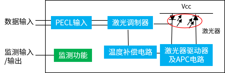 DATA與DATA的數(shù)據(jù)信號(hào)交流輸出。并具有無光告警功能,當(dāng)光功率不足以維持模塊正常工作時(shí),SD端產(chǎn)生邏輯低信號(hào),產(chǎn)生告警。
