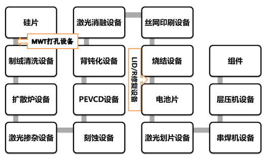 1)MWT打孔設備:應用金屬穿孔卷繞技術進行激光打孔,將電池正面電極搜集的電流通過孔洞中的銀漿引導背面,而消除正面電極的主柵線,從而減少正面柵線的遮光。由于MWT電池較為小眾,該設備僅在日托光伏等企業(yè)有少量應用。