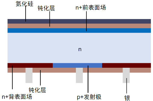 TOPCon全稱Tunnel Oxide Passivated Contact,即隧穿氧化層鈍化接觸太陽能電池結構。2013年德國Fraunhofer太陽能研究所首次提出TOPCon電池結構,使用磷摻雜的硅薄膜實現(xiàn)電子選擇性接觸,并在其與晶體硅之間制備一層小于2nm的隧穿氧化層,形成電子選擇性鈍化接觸。其隧穿原理是使得多數(shù)載流子可以隧穿氧化層,對少數(shù)載流子起阻擋作用,實現(xiàn)了載流子選擇性通過,降低少數(shù)載流子的復合速率,即規(guī)避了金屬電極接觸高復合風險,因而TOPCon電池具有較高的開路電壓。
