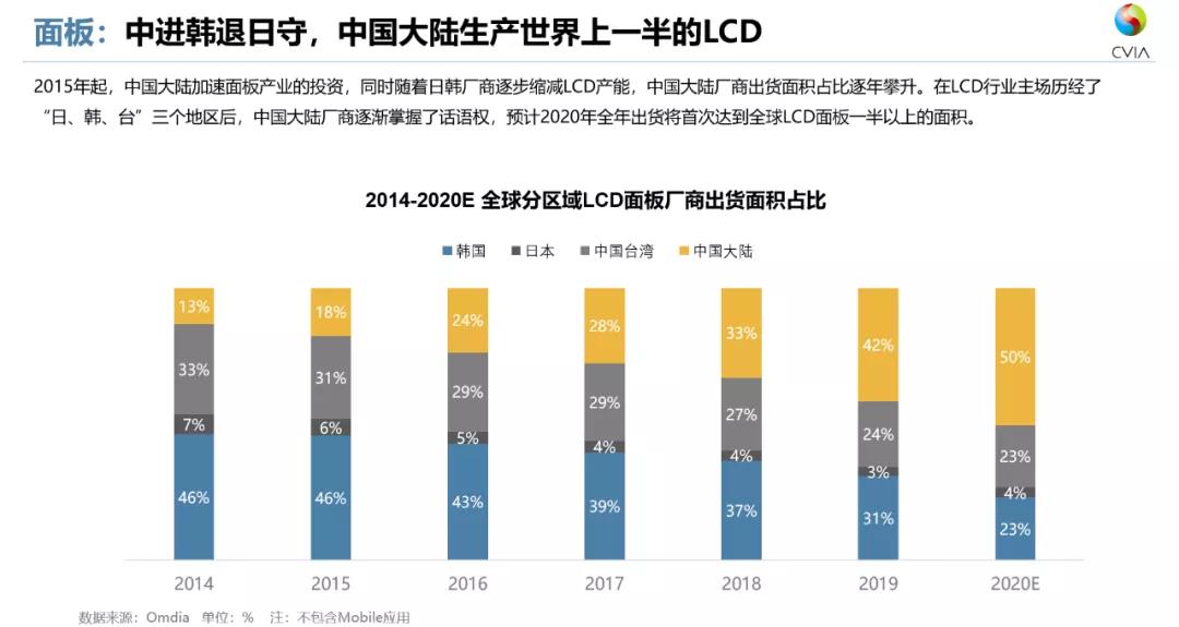 產(chǎn)業(yè)方面,中國(guó)的話語(yǔ)權(quán)不斷提升,是中進(jìn)韓退日守的一個(gè)趨勢(shì)。盡管三星、LG今年已經(jīng)推遲了退出LCD產(chǎn)業(yè)的時(shí)間表,但已經(jīng)發(fā)生的是LG悉數(shù)賣(mài)掉了光刻膠,玻璃,偏光片等相關(guān)上游業(yè)務(wù)。2015年開(kāi)始,中國(guó)大陸作為一個(gè)后發(fā)者,加速高世代面板投資。2020年全年出貨將首次達(dá)到全球LCD面板一半以上的面積。根據(jù)洛圖科技(RUNTO)數(shù)據(jù),到2019年,手機(jī)面板自給率達(dá)69%,TV面板自給率突破72%。