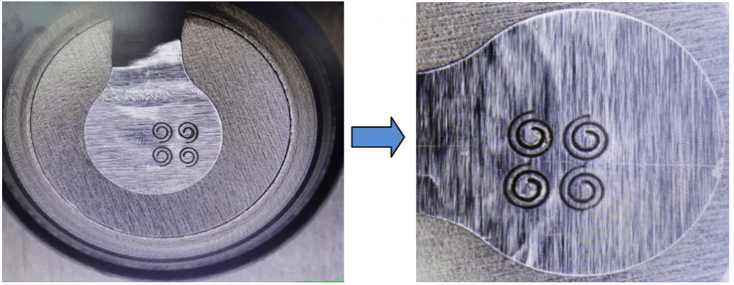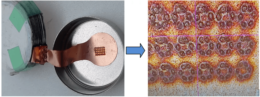 上圖為紐扣電池電芯正極與不銹鋼殼體的焊接成品圖,正極為鋁箔。鋁材導(dǎo)電性較好,也屬于高反光材料,對激光的吸收率較低,在20%左右。采用MOPA激光螺旋式焊接方式,焊接能量均勻,焊接點形狀、熔深、牢固度一致性較好,外觀平滑美觀,無變形。焊接效果放大后如圖2中右圖所示,螺旋線焊接軌跡均勻,線條無虛焊,鋁箔無變形,電池殼體背面無變色等不良情況,焊接牢固可靠,符合客戶要求。