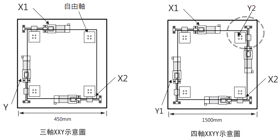 因制程不斷提升,為了能讓超大尺寸的XXY平臺也能精準對位,由上圖可知,XXYY是把XXY中的自由軸也加上馬達,使之稱為可主動帶動運動軸的軸向,故稱作XXYY。