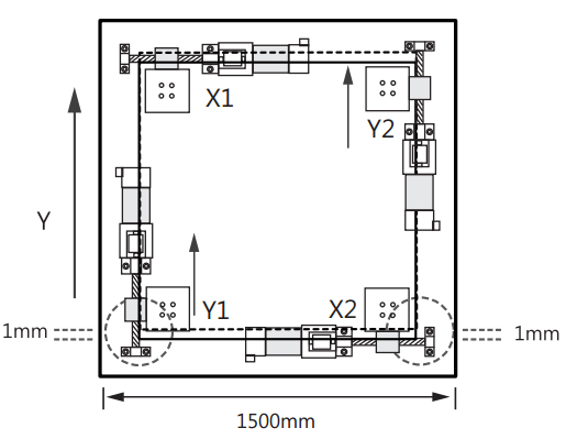 X1和X2不動作進行計策,此時進行Y方向移動1mm,因大臺面的原因,Y1和Y2共同進行運動,讓整個臺面正確移動,不產(chǎn)生誤角度,定位準確。