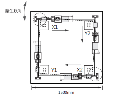 X1和X2不動作進行計策,此時進行Y方向移動,因大臺面的原因,單Y1推動的力量和機構(gòu)間存在的微小間隙,可能會導致整個臺面的移動不正確,產(chǎn)生誤角度出現(xiàn),出現(xiàn)定位失準現(xiàn)象。