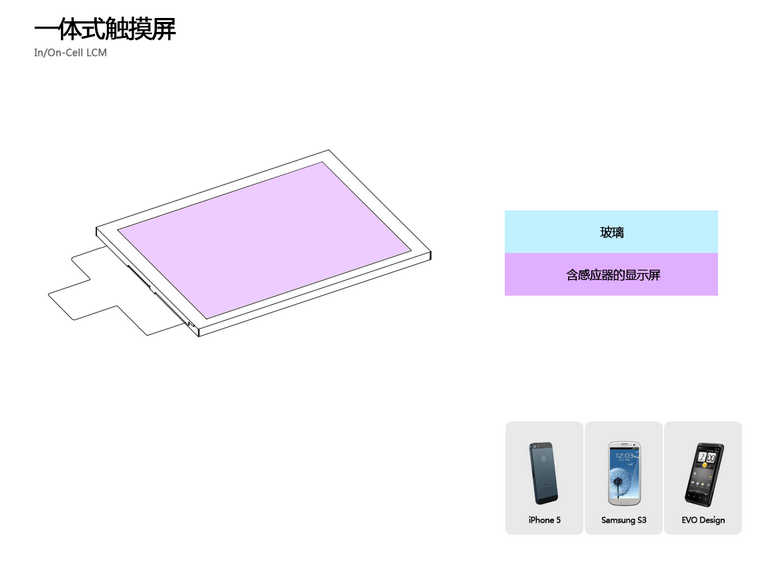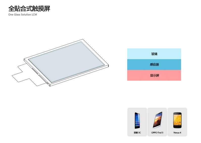 從結(jié)構(gòu)圖可以看出,感應(yīng)器與顯示屏之間的玻璃是不必要的,于是從2013年開始,主流價位手機(jī)中大量出現(xiàn)了使用“全貼合屏幕”的產(chǎn)品。