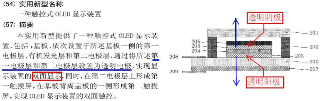 雙透型雙面OLED顯示裝置,單發(fā)光模組,模組厚度小,但是F-P諧振腔效應(yīng)較差,出光效率低,其實(shí)通過將陽極和陰極同時(shí)設(shè)置為透明結(jié)構(gòu),進(jìn)而在相對(duì)的兩個(gè)表面獲得出射光束,實(shí)現(xiàn)雙面顯示,具體的解決方案可參見專利CN203630761U: