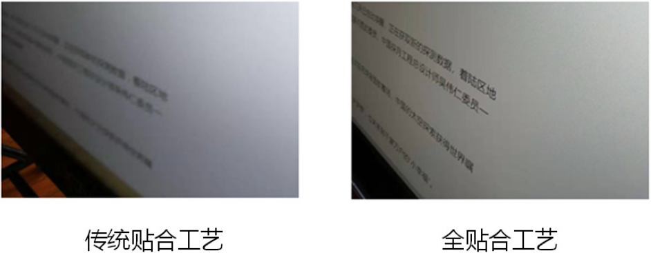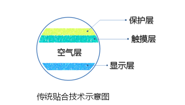 傳統(tǒng)貼合工藝,就是把保護(hù)玻璃和觸摸層完全貼合,再與顯示層進(jìn)行邊框貼合,中間會(huì)有空氣層。