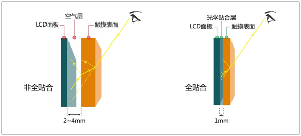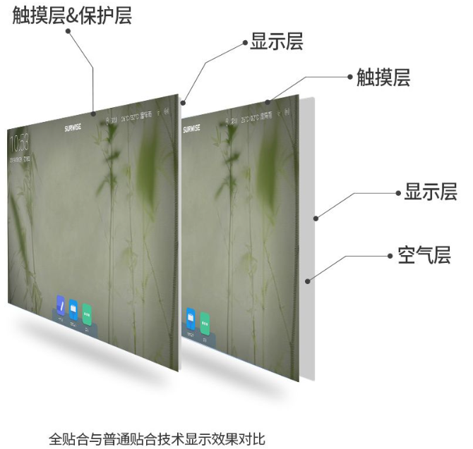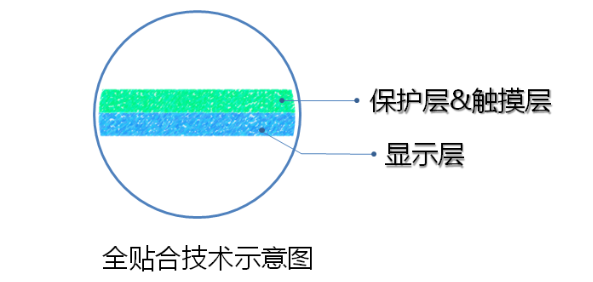全貼合工藝,就是把觸摸層做到保護(hù)層上,再和顯示層完全貼在一起,沒有中間空氣層。