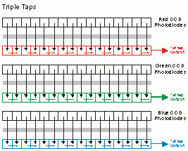 雖然3 CCD各別有獨(dú)立的 Data Clock, 但是因?yàn)楸匦枰猂, G, B 的數(shù)據(jù)組合在一起才會(huì)變成線性的彩色影像, 所以實(shí)際速度并沒有因?yàn)槊總€(gè)CCD 有獨(dú)立的 Data Clock而加快。
