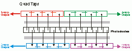 目前這類的設(shè)計(jì)是出現(xiàn)在超高分辨率(例如:12288pixel)的機(jī)種上, 除了分出前后段,而且各分出四組輸出, 因此取像速度可以提高成八倍而不會(huì)因?yàn)榉直媛屎芨叨尵€周期(Line Period) 拖太長。