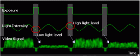 ① 下圖所示為一般區(qū)域掃描 (Area-scan) 攝影機(jī) (取像速度大約在30fps) 在一般室內(nèi)日光燈源 (交流電源, 頻率為60Hz) 下的示波器取像訊號。日光燈的閃爍頻率對這樣的攝影機(jī)的曝光時(shí)間而言, 并不會(huì)有太大影響, 使用者仍然可以取得亮度均勻的影像。