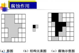 腐蝕運算作用:消除物體邊界點,使邊界點向內部收縮,可以把小于結構元素的物體去除。選取不同大小的結構元素,去除不同大小的物體。如兩個物體間有細小的連通,通過腐蝕可以將兩個物體分開。