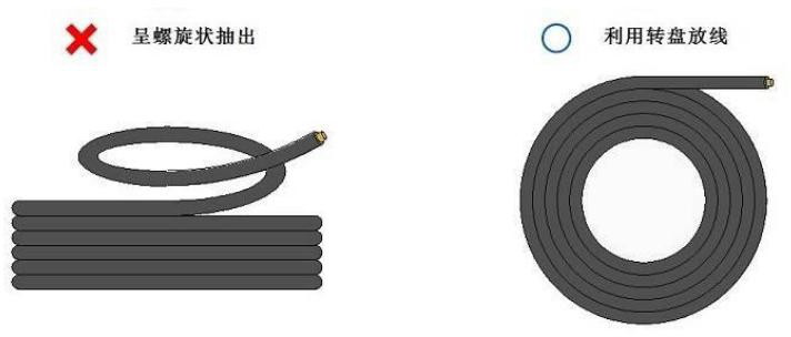 取出拖鏈電纜時,一定不能扭曲。不可以從電纜卷筒或電纜盤的某一端解開電纜,應(yīng)該先旋轉(zhuǎn)卷筒或電纜盤將電纜展開,不用時可以將電纜展開或者懸掛起來。