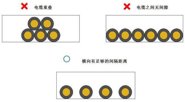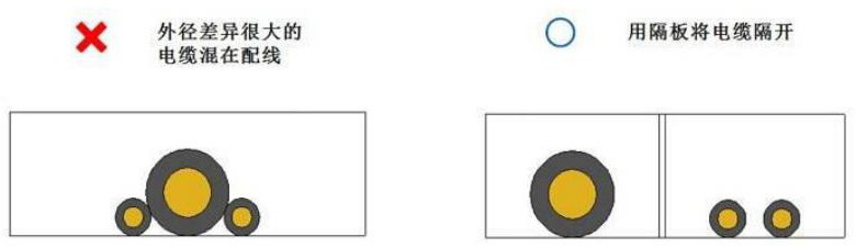 外徑差異很大的電纜混在配線,需要隔板將電纜隔開,防止細線被粗線壓迫并且容易斷線。