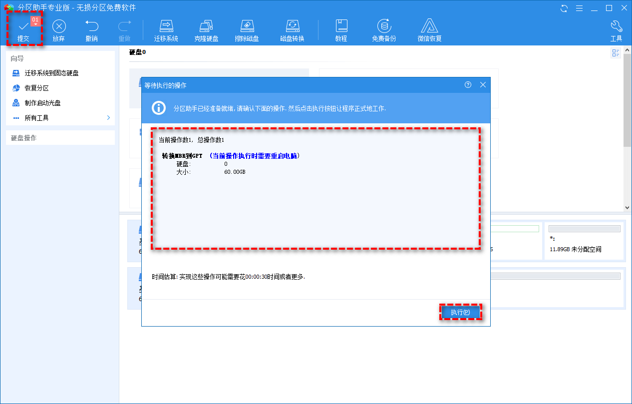 5、返回主界面,單擊左上角“提交”按鈕以預(yù)覽即將進(jìn)行的任務(wù),確認(rèn)無誤后單擊“執(zhí)行”以開始將MBR轉(zhuǎn)換成GPT磁盤