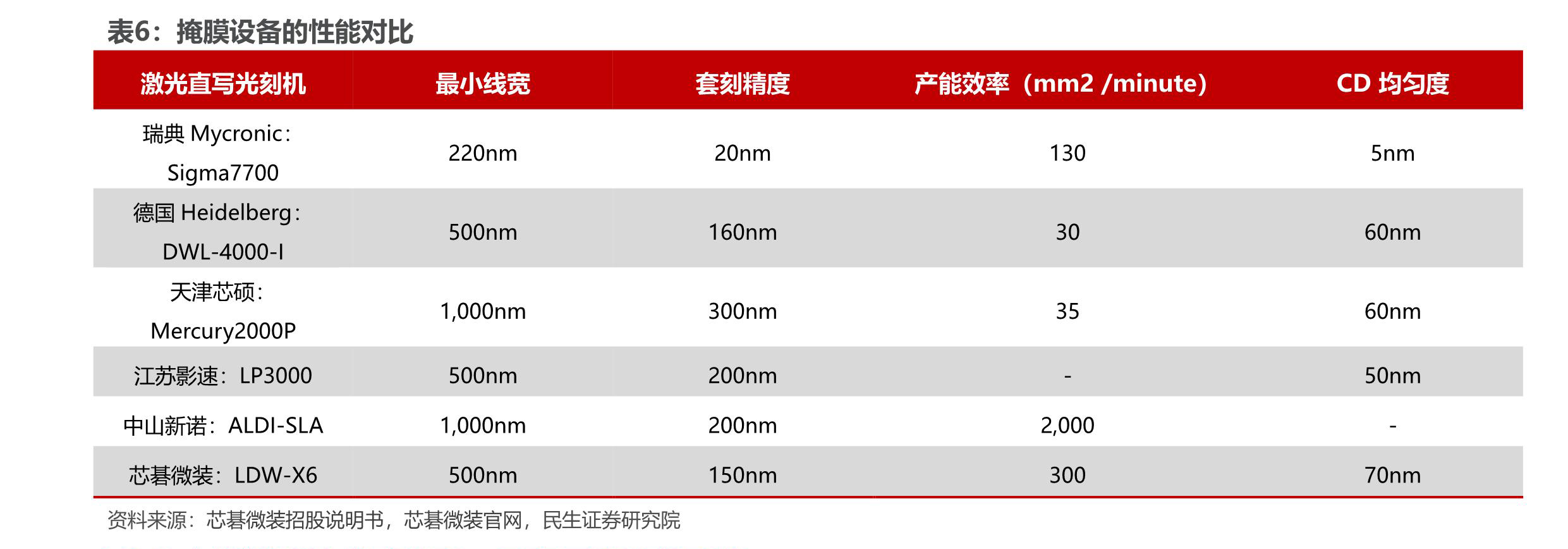 國(guó)內(nèi)企業(yè)中,芯碁微裝、江蘇影速、天津芯碩等企業(yè)能夠?qū)崿F(xiàn)此類(lèi)設(shè)備的產(chǎn)業(yè)化,芯碁微裝在激光掩膜版制版領(lǐng)域的技術(shù)水平已經(jīng)能夠與德國(guó) Heidelberg進(jìn)行競(jìng)爭(zhēng)。通常用于判斷掩膜設(shè)備技術(shù)水平的關(guān)鍵指標(biāo)為:最小線(xiàn)寬、套刻精度產(chǎn)能效率和 CD 均勻度等。